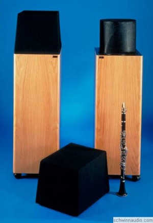 The Walsh 300 was the largest of the straight sided tower Walsh speakers that replaced the truncated pyramid cabinets of the earlier Walsh speakers. The Walsh 300 used real wood veneer cabinets with sharp 90 degree corners. They were made in matched mirror image pairs. There was an Ohm logo near one corner and a ”300” label next to it on the next side. When set up for peak performance, the Ohm logo was on the front of the left speaker and the ”300” on the front of the right speaker. This system was designed for smaller rooms.
