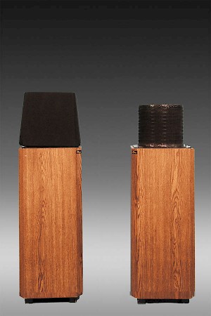 The FRS-11 is a 43” tall square tower with each corner cut about 2”. One of the cut corners displays the Ohm logo near the top, just below the grill. The FRS-11 is a true Walsh speaker designed for small to medium sized rooms. They create a precise stereo image from a very wide Sweet-Sweep. We call the effect Full Room Stereo and we named it after this benefit.