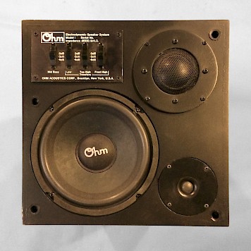 The Ohm I’s cabinet was a compact, floor standing design of a little over 15” square near the bottom tapering to 13” square at the top (34” above the floor). This allowed it occupy about the same space as a full-sized bookshelf speaker mounted on the appropriate stand. It was quite small for its tremendous output ability.