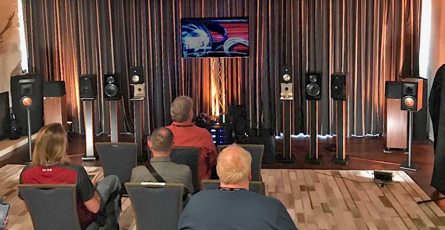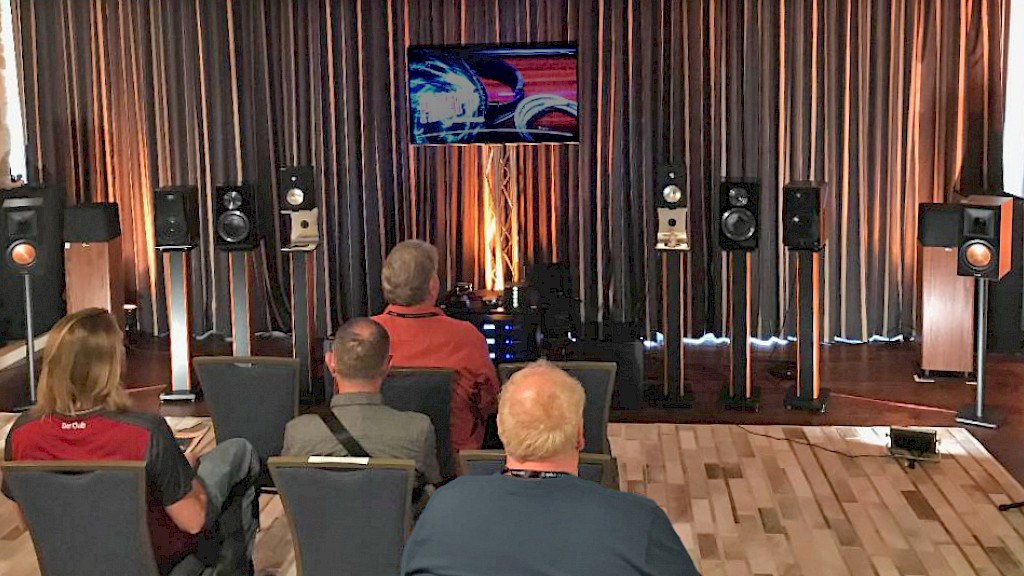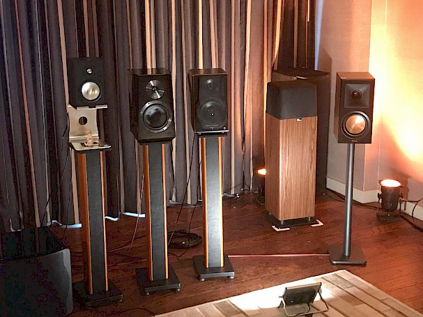 Even with their unlikely position, stuffed into the corners along the long wall of the room, they were doing everything that we would expect them to do. They produced an improbably believable center image that stayed firmly in place no matter where you stood in the room, and the sound field was noticeably more spacious than with any of the conventional, forward-firing speakers that were being exhibited.