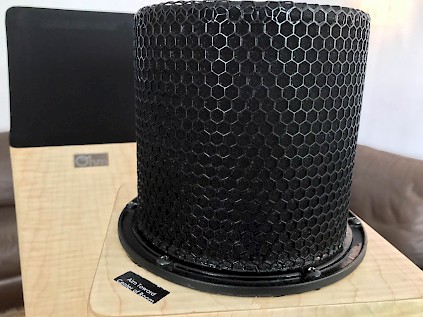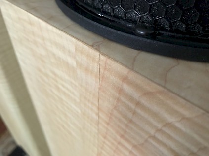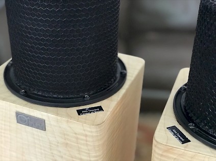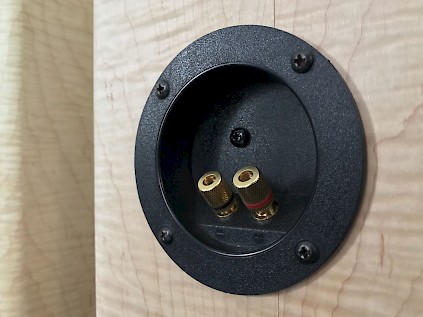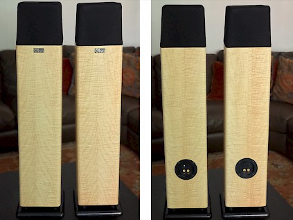 The Ohm Walsh use a speaker design that’s probably different from anything you’ve seen (or heard) before. About 80% of the Walsh is taken up by its rounded-square cabinet, which is supported about two inches above its base by standoffs. The upper portion of the Walsh are magnetically-placed speaker grilles which, when removed, reveal yet another set of speaker grilles, though the latter are not removable. Each speaker has a single set of cable binding posts on the rear (spades, banana plugs, and bare wire supported) and a downward-facing bass port hidden between the bottom of the cabinet and its base. Though the Walsh feel solid, they are clearly hand-built products; tiny imperfections like an occasional over-torqued screw or blob of glue will either be disappointing or add to the character of these speakers, depending on your perspective. Our review unites were finished light-tan maple veneer (we’re not sure of the core material of the cabinets); it’s a purely subjective choice, but we think that the darker woods look better with the black grilles and base of the Walsh.
