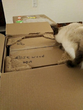 She is a Balanese , the long haired variant of the Siamese. Great cat, and like all of them attracted to boxes like moths to porch lights. The speakers are even nicer in real life, heavy as hell and dead solid. STILL haven’t heard them yet! Had to host and MC a 25th anniversary reception for my work tonight and have Christmas dinner for the board and shareholders tomorrow. Wednesday it will be…the universe keeps throwing obstacles my way. At least they are here in my living room.